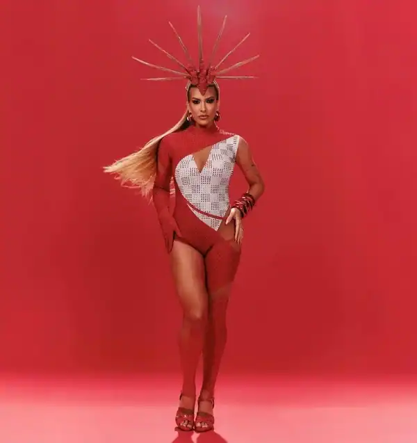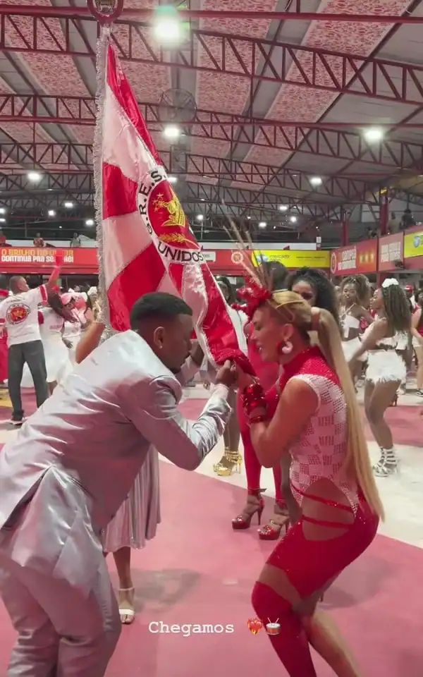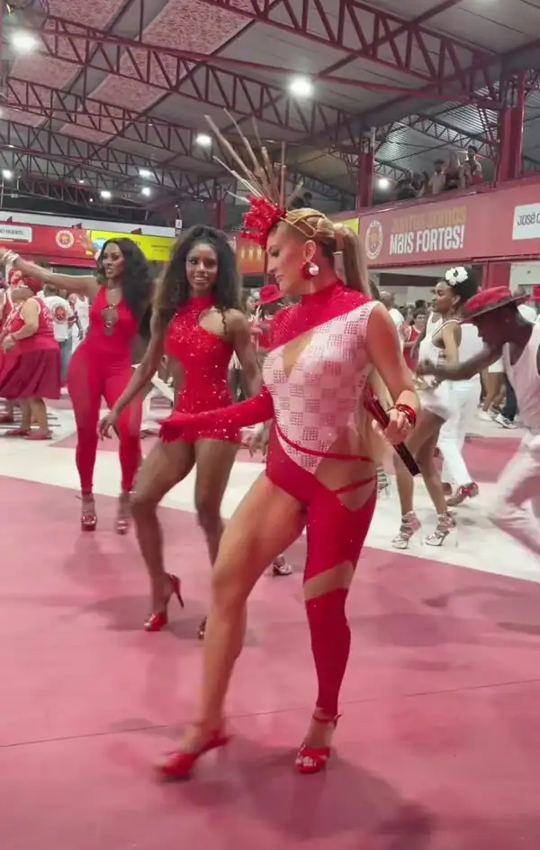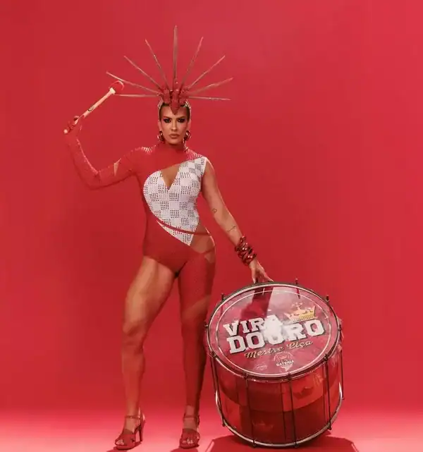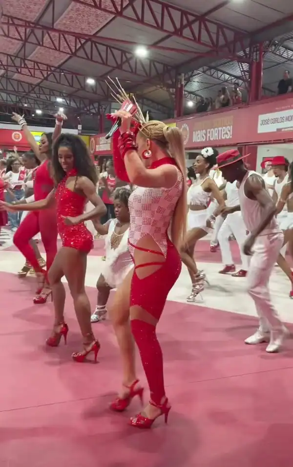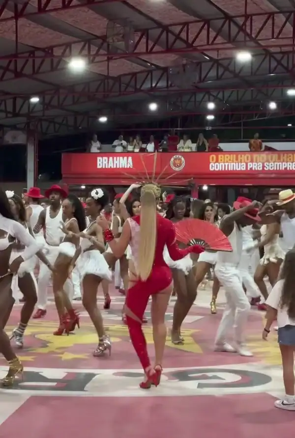 A dançarina Lore Improta mostrou todo seu gingado durante o ensaio da escola de samba Unidos do Viradouro, em Niterói (RJ), na noite desta terça-feira (9/12). Grávida do segundo filho com o cantor Léo Santana, ela exibiu a barriguinha em um look inspirado no enredo da escola, “Virando o jogo”, que homenageia o desfile de 2007. A fantasia remetia ao momento icônico em que o Mestre Ciça subiu em um carro alegórico, levando a bateria junto e transformando os instrumentos em coreografia.