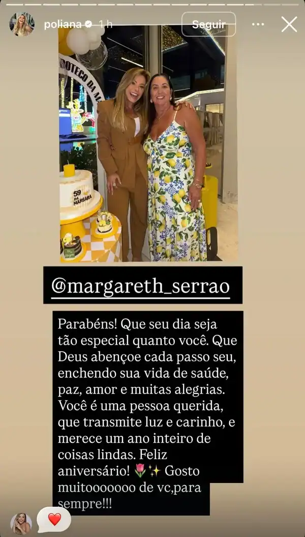 Na publicação, Poliana expressou carinho e admiração pela aniversariante, desejando saúde, paz e amor. “Gosto muito de você, para sempre”, escreveu ela, reforçando que, mesmo após o fim do casamento dos filhos, o afeto entre as famílias permanece forte. Em outra mensagem, Poliana destacou a luz e o carinho que Margareth transmite, desejando um novo ano repleto de alegrias.