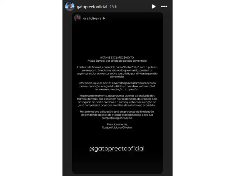 A nota conclui reiterando que a situação está em processo de finalização e que falta apenas a conclusão de etapas burocráticas para a liberação do influenciador. A equipe jurídica reforça o comprometimento de Gato Preto em resolver a questão judicial e regularizar sua situação.