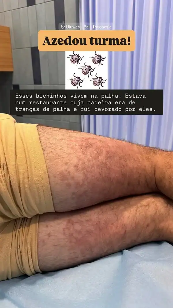 “Esses bichinhos vivem na palha. Eu estava em um restaurante onde as cadeiras eram feitas de tranças de palha e fui devorado por eles”, escreveu o ator, que também descreveu os sintomas: “Coceira absurda + inflamação + urticária”, disse ele, acrescentando que precisou tomar uma medicação injetável.