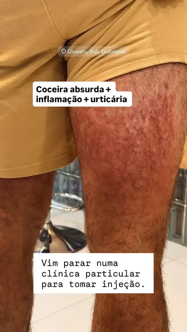 Malvacini publicou nos Stories algumas fotos mostrando a irritação em sua pele, explicando que teve que buscar atendimento em uma clínica particular. O ator relatou que estava sentado em um restaurante com cadeiras de palha, local onde os aracnídeos estavam escondidos.