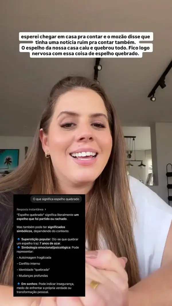 A apresentadora preferiu não contar o acidente por mensagem e quis conversar pessoalmente com o marido. No entanto, ao chegar em casa, foi surpreendida por mais um problema: um espelho da casa do casal, em Itaipava, no Rio de Janeiro, havia quebrado totalmente. “Quando coisa ruim acontece, vem uma atrás da outra”, afirmou.