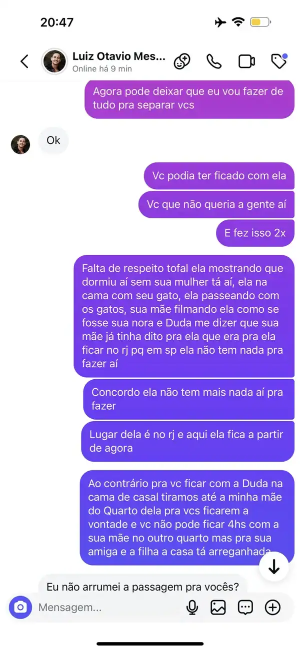 Além disso, conversas privadas também passaram a ser divulgadas nas redes, indicando desentendimentos e tensão nos bastidores do relacionamento. Em uma delas, Camila compartilhou uma conversa com o ex-genro, na qual dizia que “faria de tudo” para separar os dois.