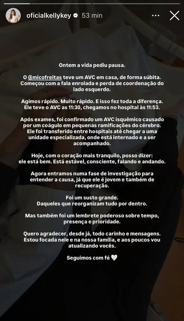 Nas redes sociais, Kelly Key relatou detalhes sobre os sintomas iniciais do marido. “Ontem a vida pediu pausa. O Mico Freitas teve um AVC em casa, de forma súbita”, contou Kelly em seu perfil no Instagram. Segundo a cantora, os primeiros sinais apareceram rapidamente, e eles buscaram socorro imediatamente, o que ajudou os médicos a identificarem o problema a tempo. “Começou com a fala enrolada e perda de coordenação do lado esquerdo. Agimos rápido. Muito rápido. E isso fez toda a diferença. Ele teve o AVC às 11h30, chegamos no hospital às 11h53”, relatou.