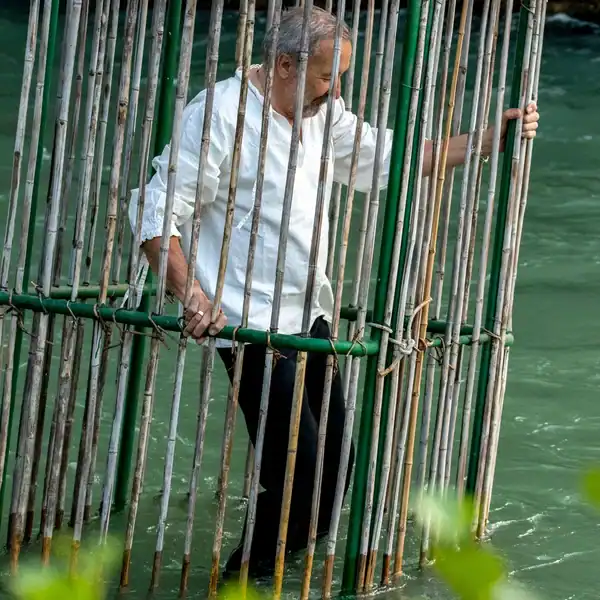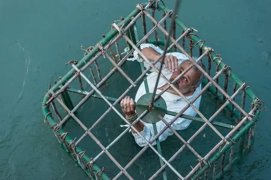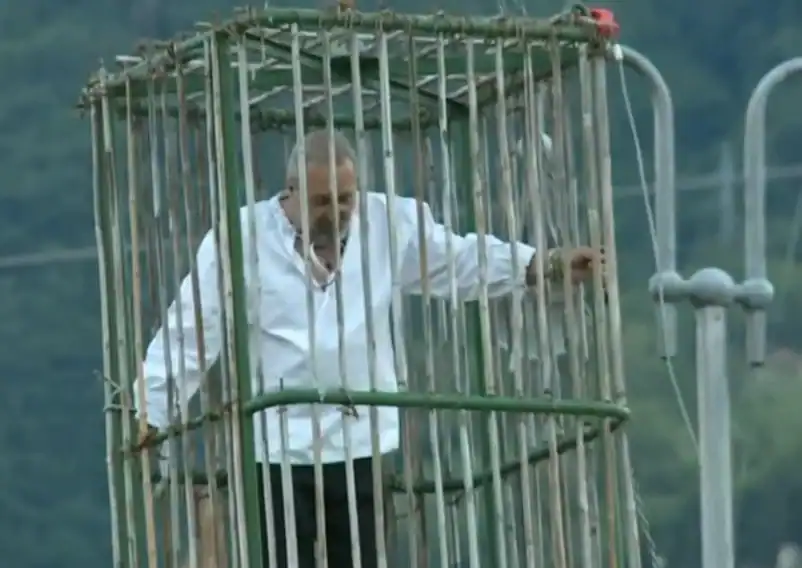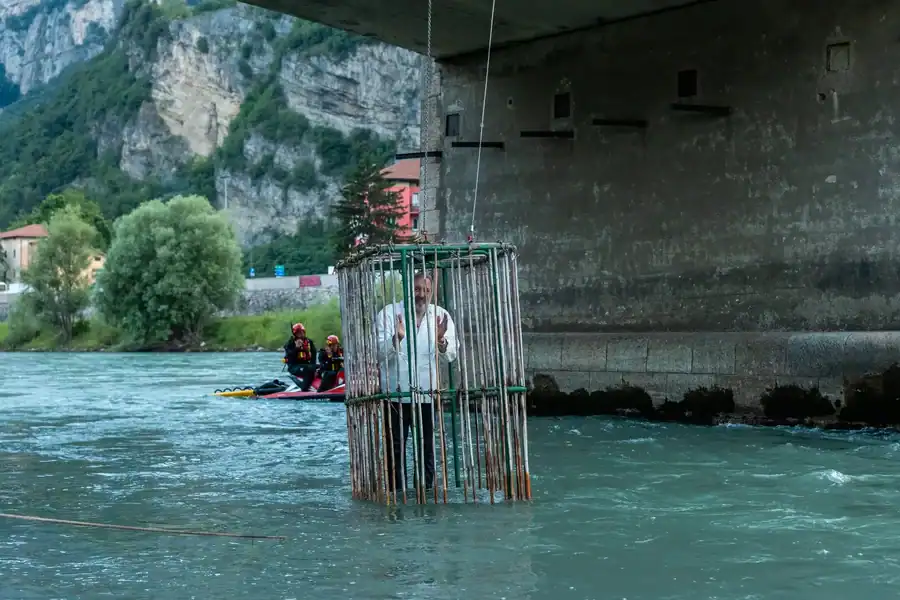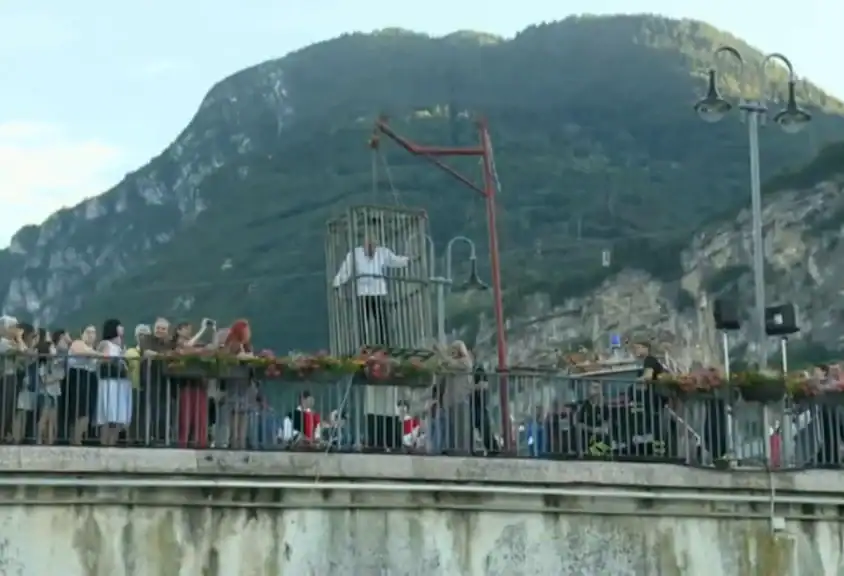 Após a leitura do veredicto, o “vencedor” é colocado em uma estrutura e mergulhado repetidamente no rio Adige, em frente ao público.